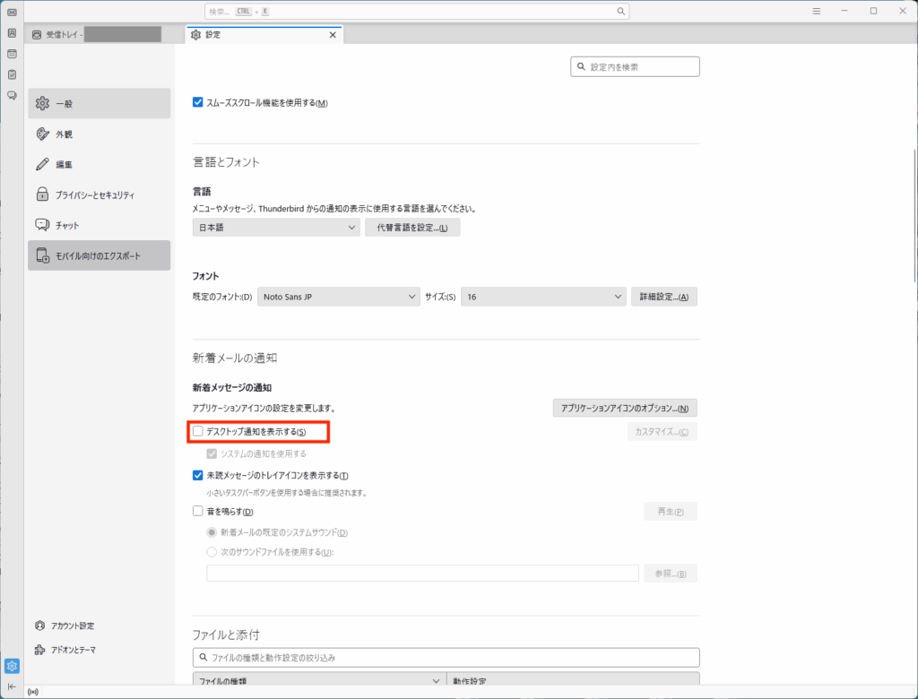 「音で知らせる」と「デスクトップ通知を表示する」のチェックを外す。