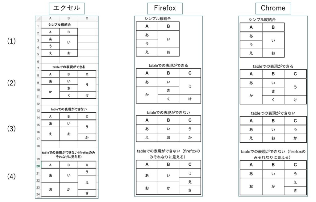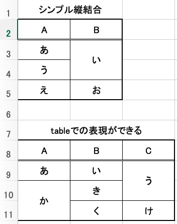 セルを縦または横に繋いだ形(エクセルでいうセルの結合)でも、rowspan、colspanを使ってこれまで特に問題に感じたことはなかった。