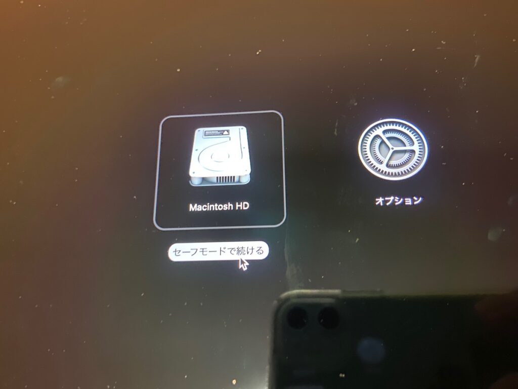 Macintosh HDかオプションを選ぶ画面で、Macintosh HDを選択し、Shiftキーを押しながら「セーフモードで続ける」をクリックする。
