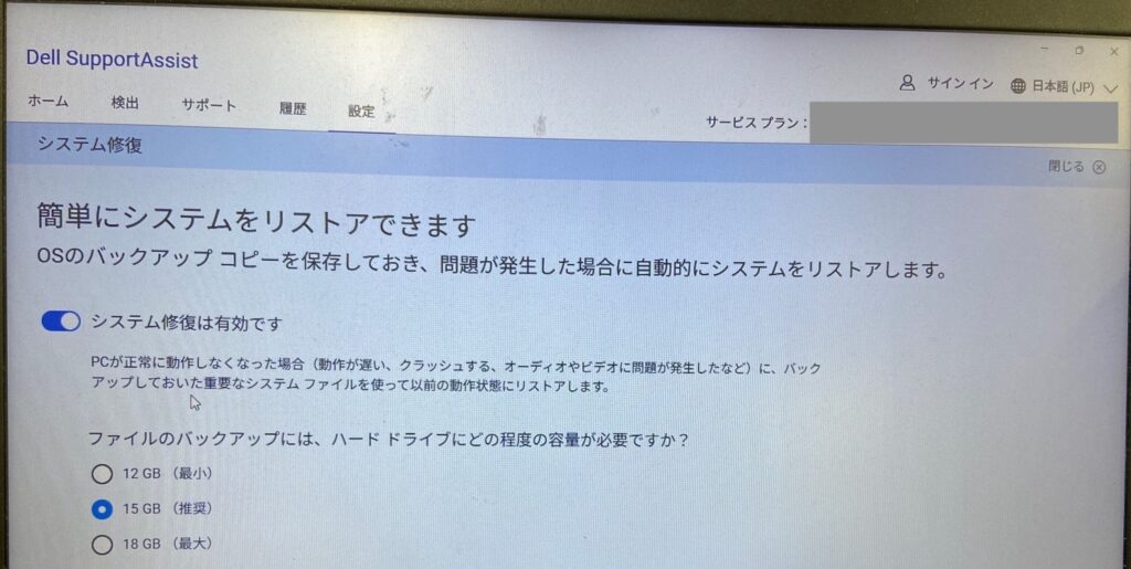 Dell SupportAssistでは、15GBまでデータ保持する設定になっていた。