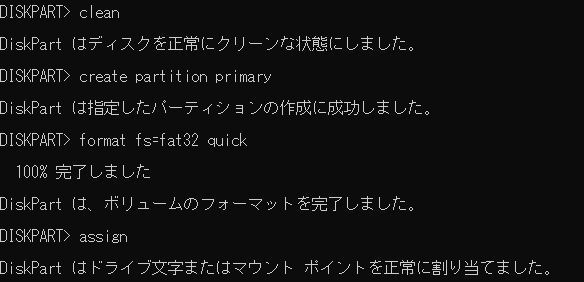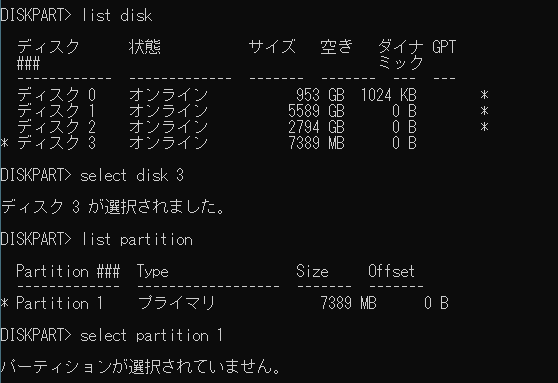 select partitionを実行しても「パーティションが選択されていません。」とエラーで先へ進めない。