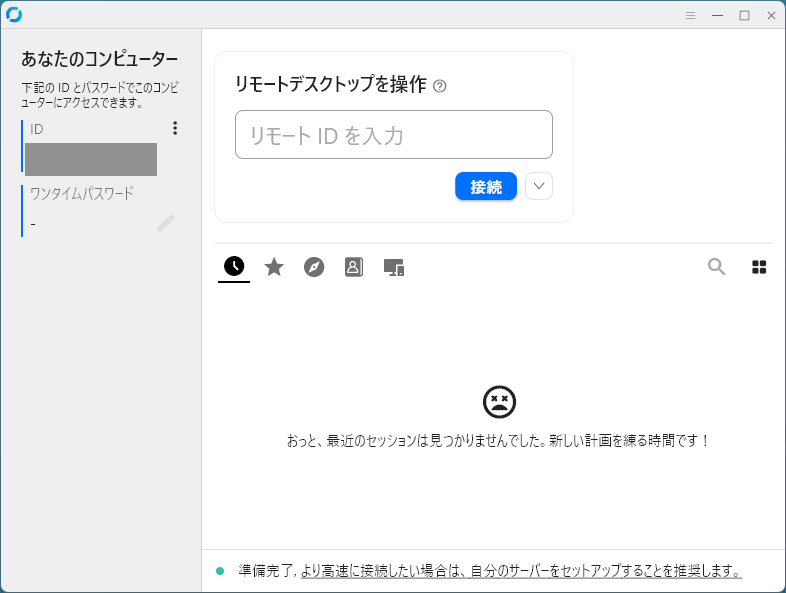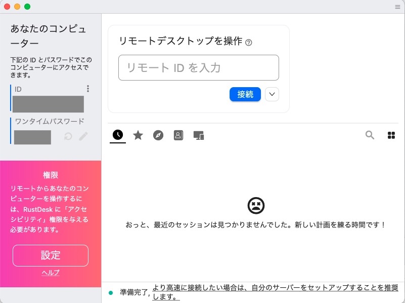 自らの意思でRustDeskを立ち上げ、メインウィンドウを開いている状態でないと相手からの接続を受け付けないという仕様でセキュリティが高まる。