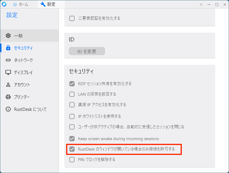 これについては、設定の中に「RustDeskのウィンドウが開いている場合のみ接続を許可する」の設定が有効だ。