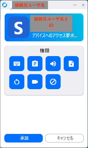 操作を受ける側はパソコンに慣れていない場合があり、接続元ユーザ名をしっかり見て確認することが難しい。よって「承諾」を押さないように伝えておくのが無難であろう。